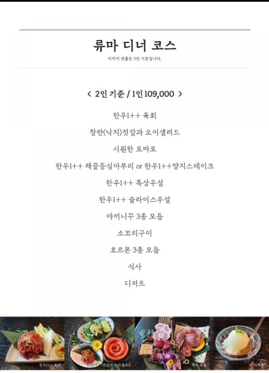 일본 정통 숯불 화로구이 야끼니꾸 전문점 일본 현지의 맛 그대로를 구현합니다. *코스요리는 1일 10팀 한정판매로 진행합니다. 코스 예약시 예약요청사항에 '류마코스' 남겨주세요