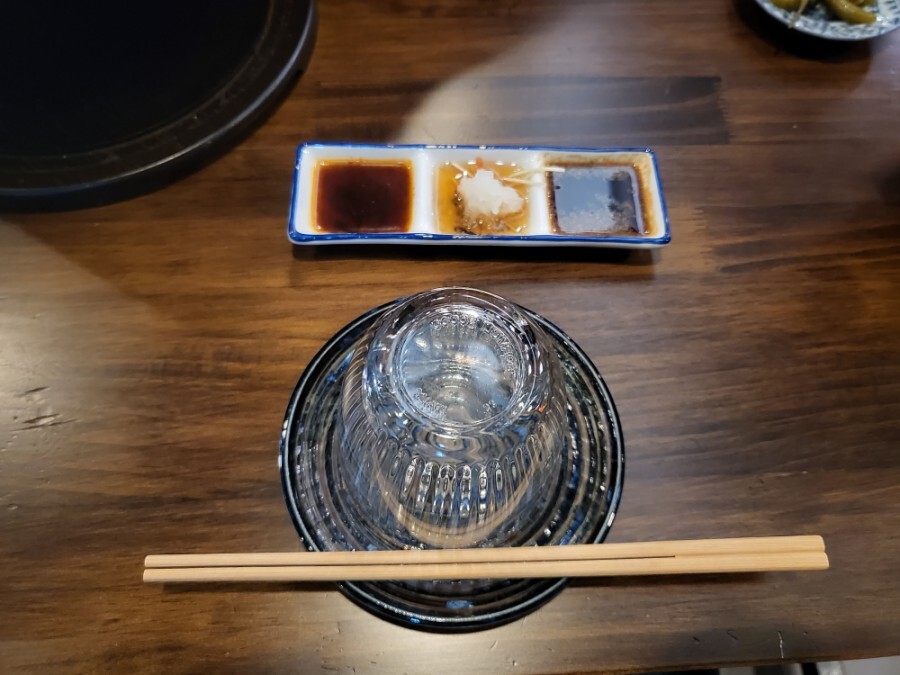 기본적으로 소스 3종과 와사비 산고추장아찌가 준비되어 있네요!