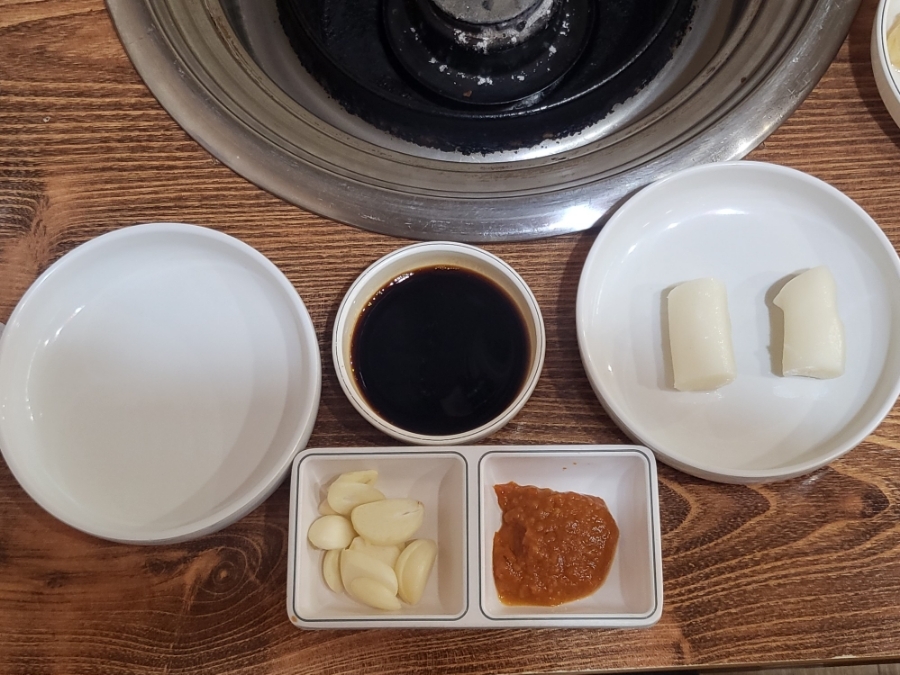 장어 소스와 마늘, 쌈장, 같이 구워 먹을 떡이 나왔어요~