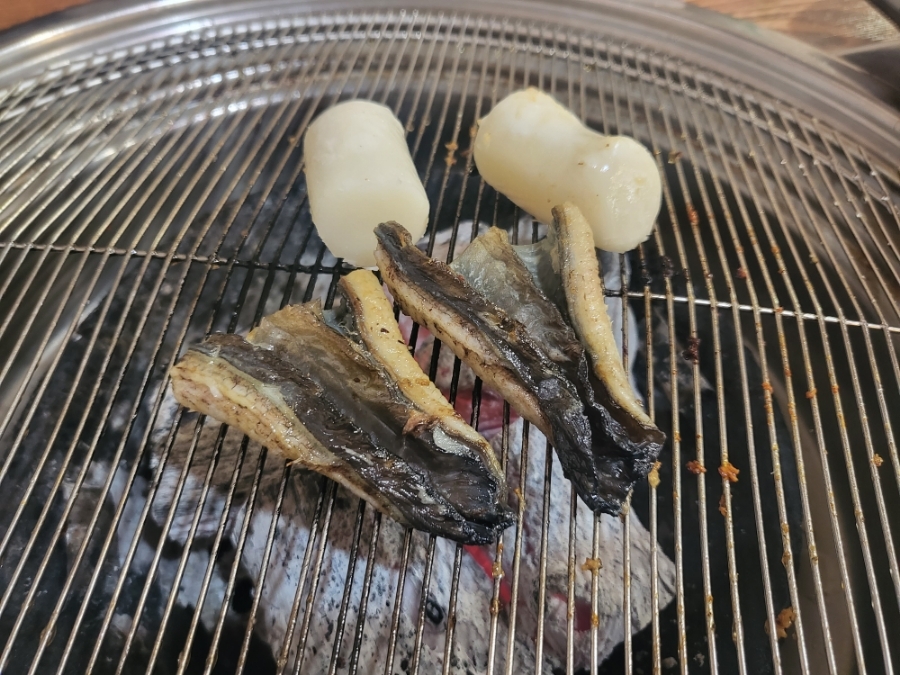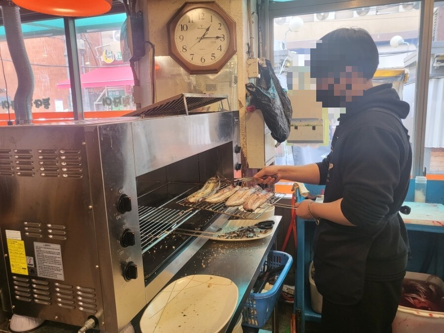 손질후 옆 초벌구위 기계를 통해 초벌하여 손님상에 나가