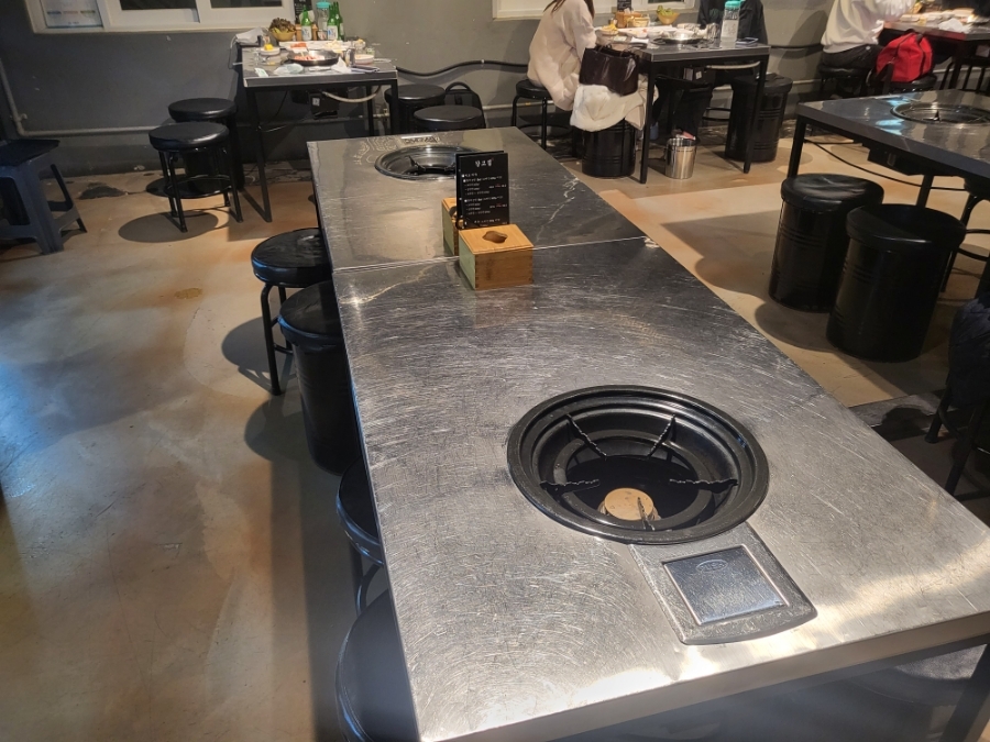 은색철판 테이블로 구성된 자리와 '고집'이라는 단어가 잘어울리는 인테리어