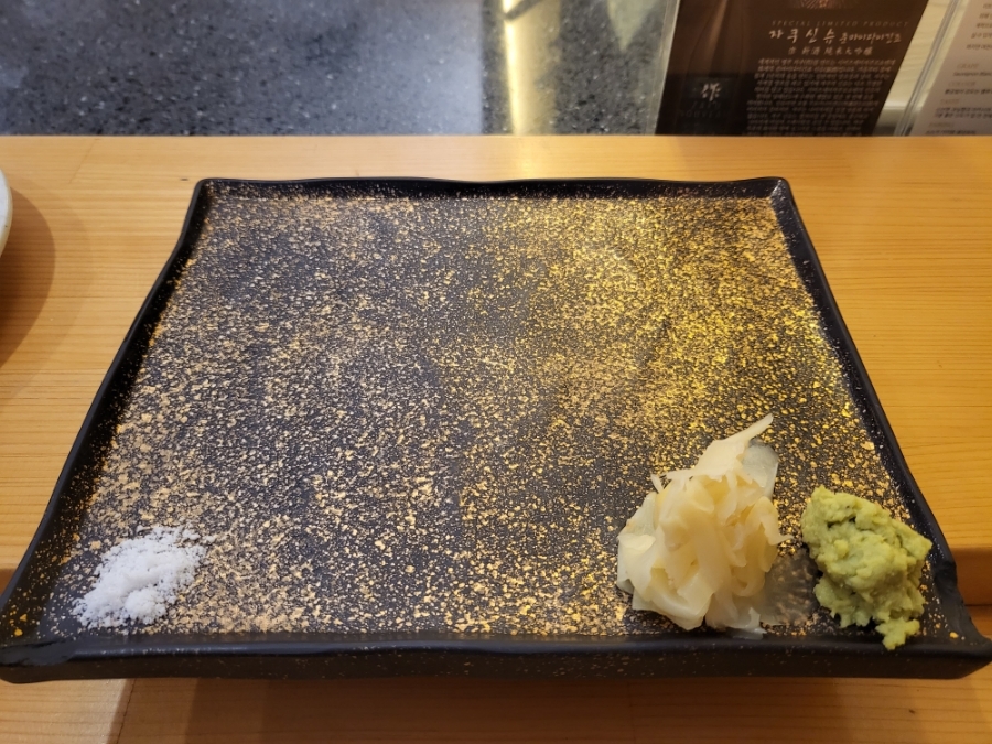 소금, 생강, 와사비, 간장 그리고 따듯한 녹차물이 준비되어 있었어요