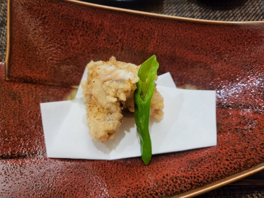 17. 아귀튀김(가라아개) - 꽈리고추도 같이 나왔고 뽀얀 속살에