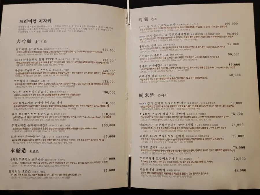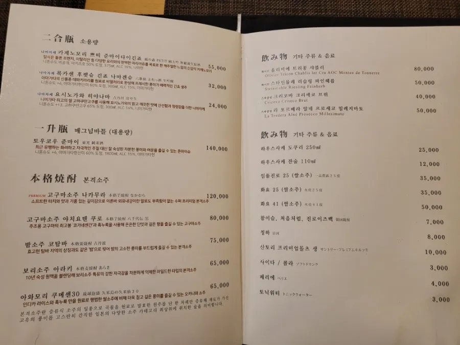 | 점심(런치) : 50,000원 저녁(디너) : 90,000원 점심2타임 : 12:00 / 13:30 저녁2타임 : 5:30 / 7:30 콜키지 와인,사케 25,000원 위스키, 소츄 잇쇼빙 40,000원 |