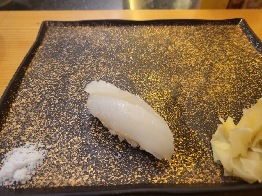 10. 무늬오징어 초밥 - 오랜만에 맛보는 무늬오징어 레몬과 소금을 뿌려 주셨고 칼집이 나있어 씹기 좋고 이에 무늬오징어에 붙었다 떨어졌다 풍미가 느껴졌던 초밥