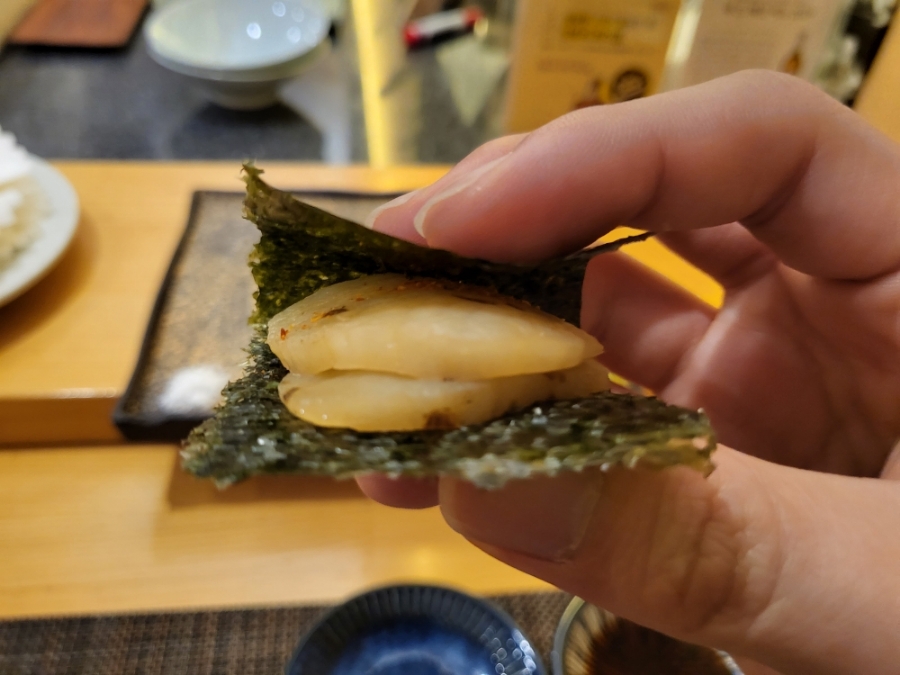 7. 김 + 관자 - 살짝 구운것 같았고 부드러운 식감과 아삭한 식감이 공존했던 음식