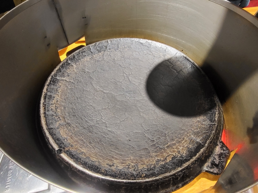 고기를 주문하면 이처럼 솥뚜껑을 뒤집은 모양이 준비되고 주위에 철판이 셋팅되어지는 모습!