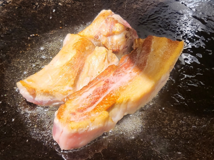 튀기듯 굽는 삼겹살과 진득한 볶음밥, 칼국수의 조화