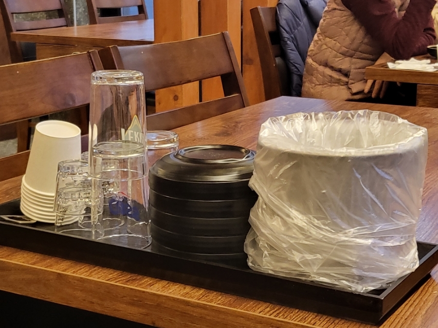 각 자리에는 물컵, 식기, 뼈통등이 놓여져 있는 구조고