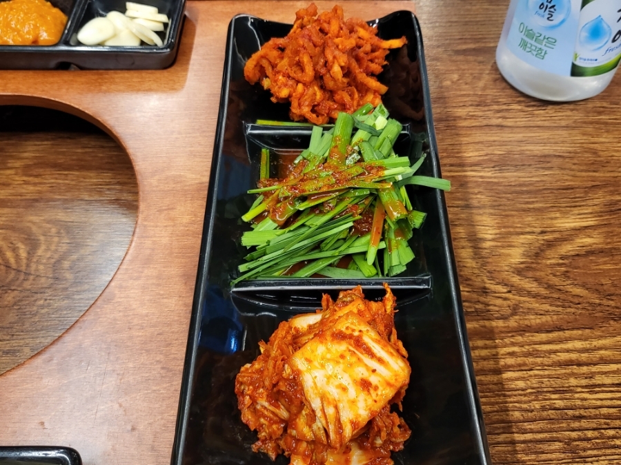 부추무침, 김치, 마늘이 준비되었네요