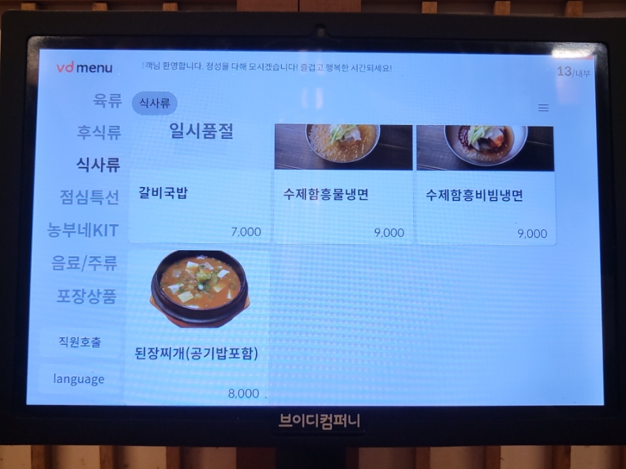 식사류로 갈비국밥과 물냉비냉, 된장찌개