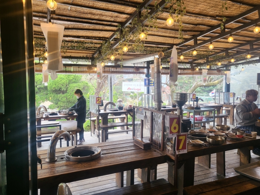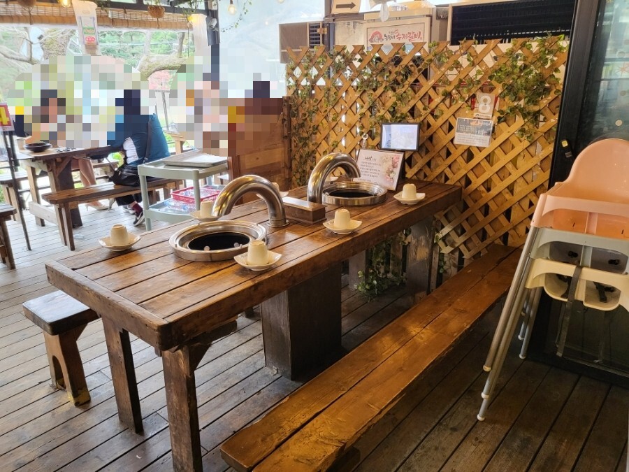 입구에 들어서면 주차장과 더불어 야외테이블에 숯을넣을 수 있는 테이블이 보이는데요!