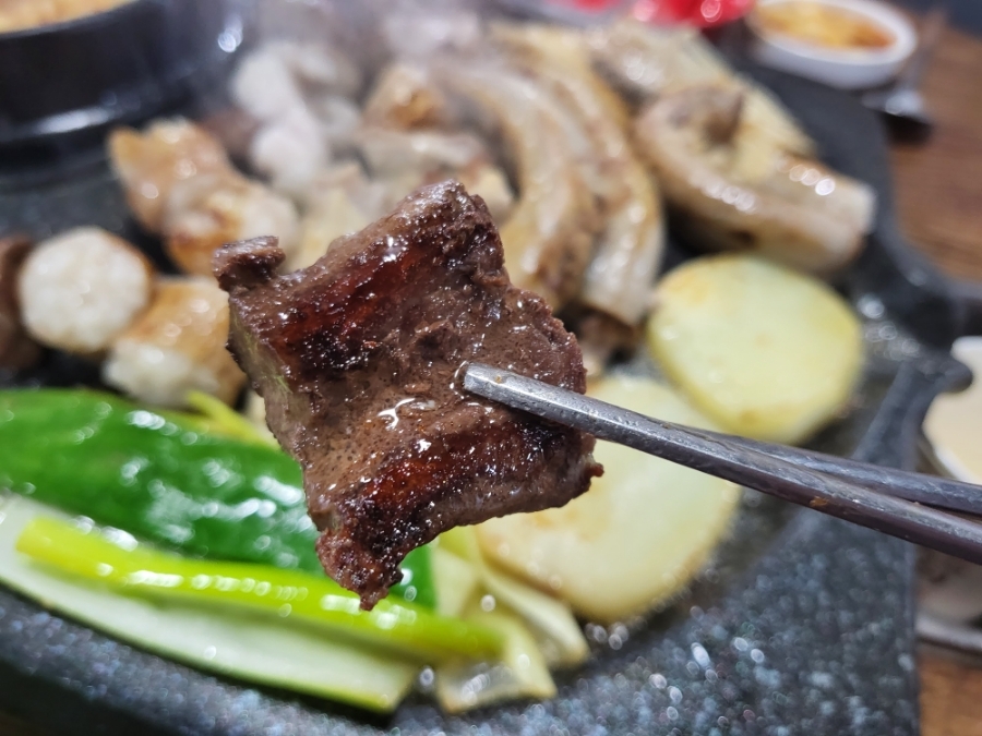 모듬곱창구이까지 다양한 음식을 불판위에서 한번에 해결할 수 있는구조!