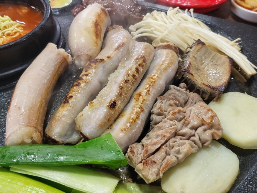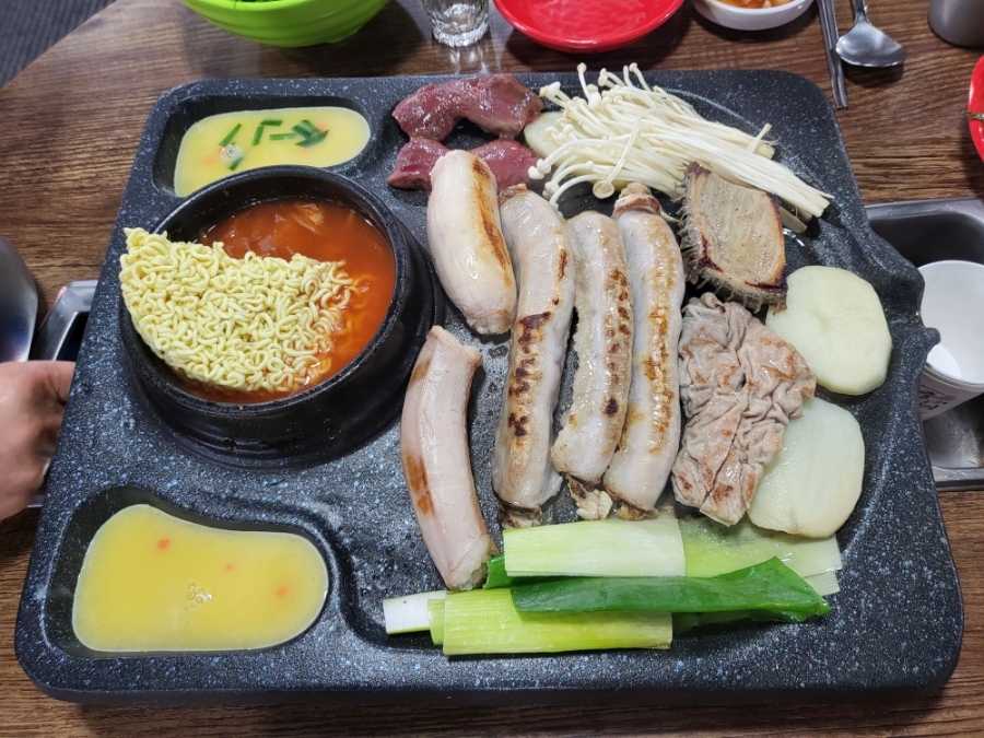 중간중간 불판에 올려져 있는 김치국 라면을 먹어주니 여러가지 음식을 시킨것 같은 기분