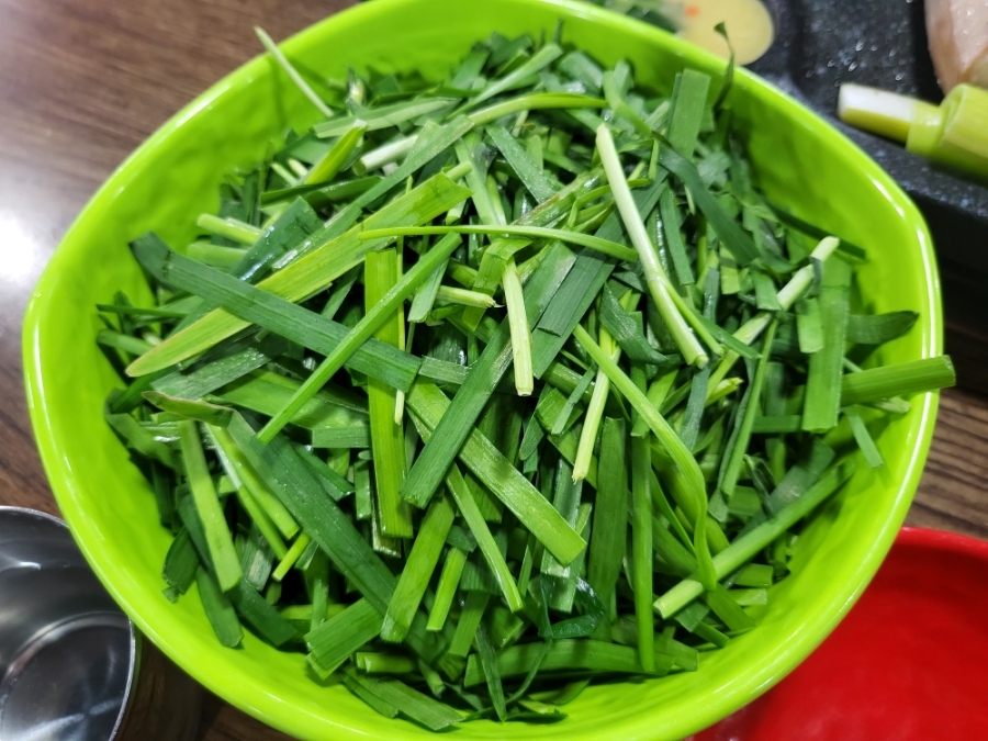 기름이 빠지는 아래부분에 밑반찬으로 나온 부추를 올려 부추구이까지