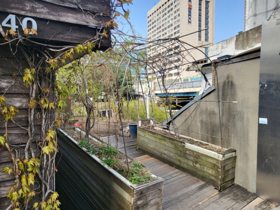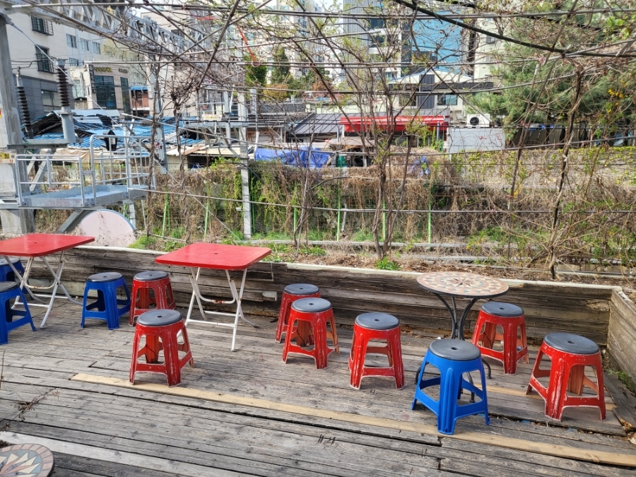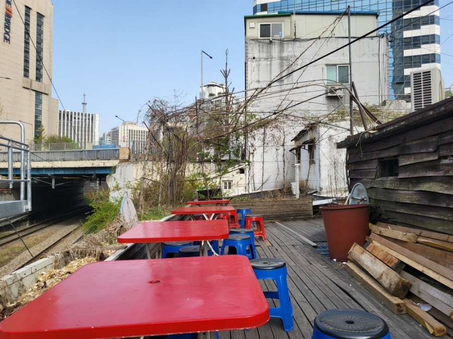 5~6개정도 되는 야외테이블이 셋팅되어있었고 철길과 주택,아파트 단지를 보며