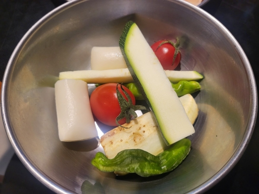 가니쉬로 꽈리고추, 호박, 세송이버섯, 방울토마토가 준비되어진 모습