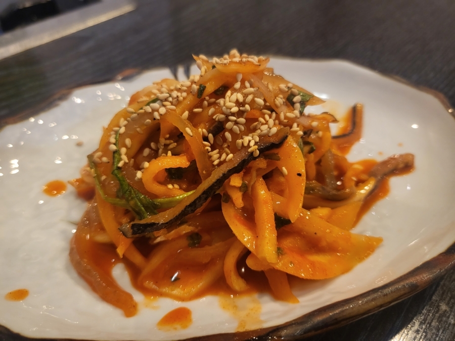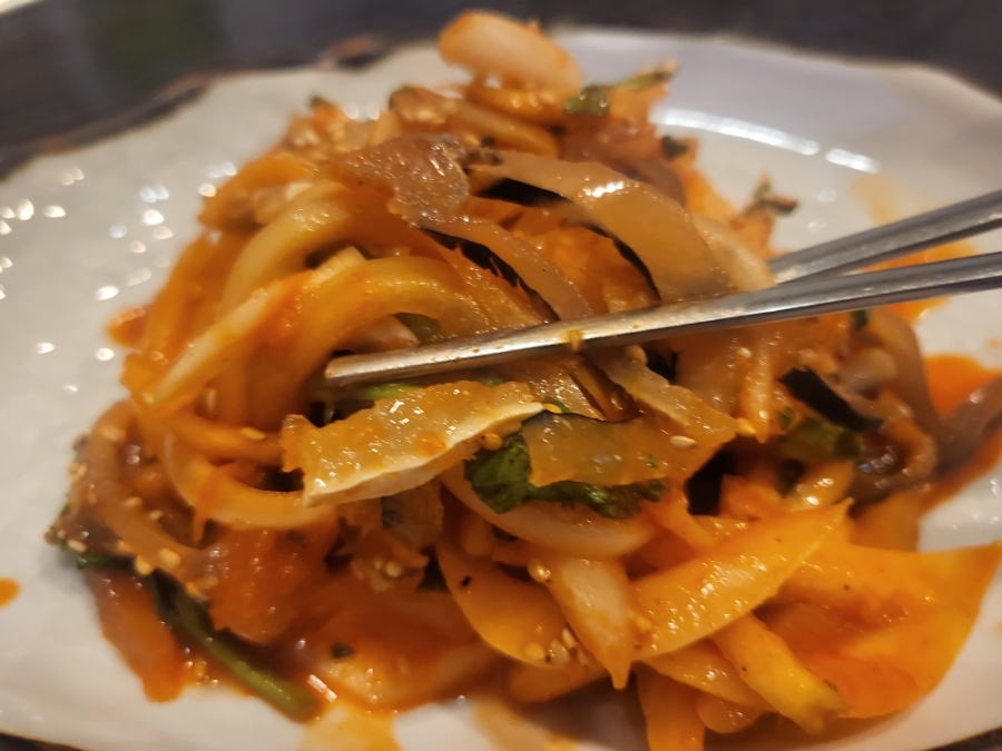 각종야채와 복어껍질이 양념으로 버무려진 음식이네요