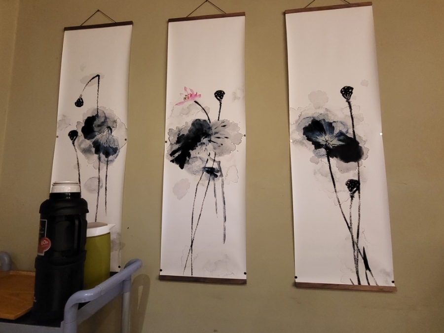 정면에 밝은 조명과 벽면에는 묵으로 만든