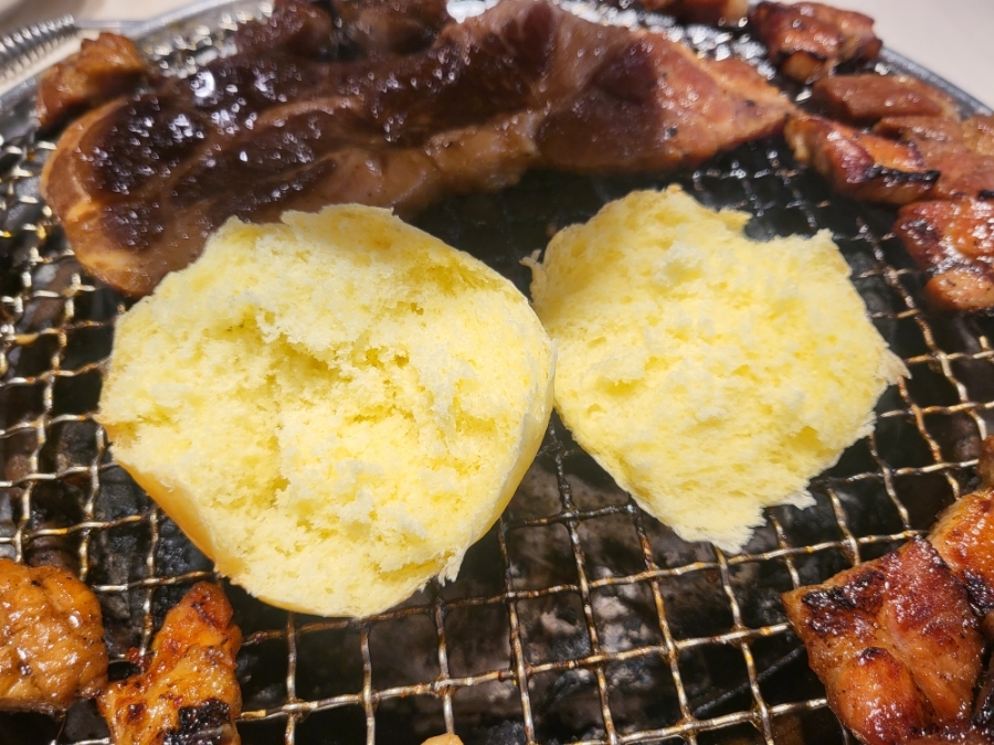 빵은 숯불에 살짝 구워 바삭거리는 식감을 유도하고 안에는 버터와 딸기잼, 마지막 잘구운 명륜진사갈비 돼지갈비를 얹으면 끝!