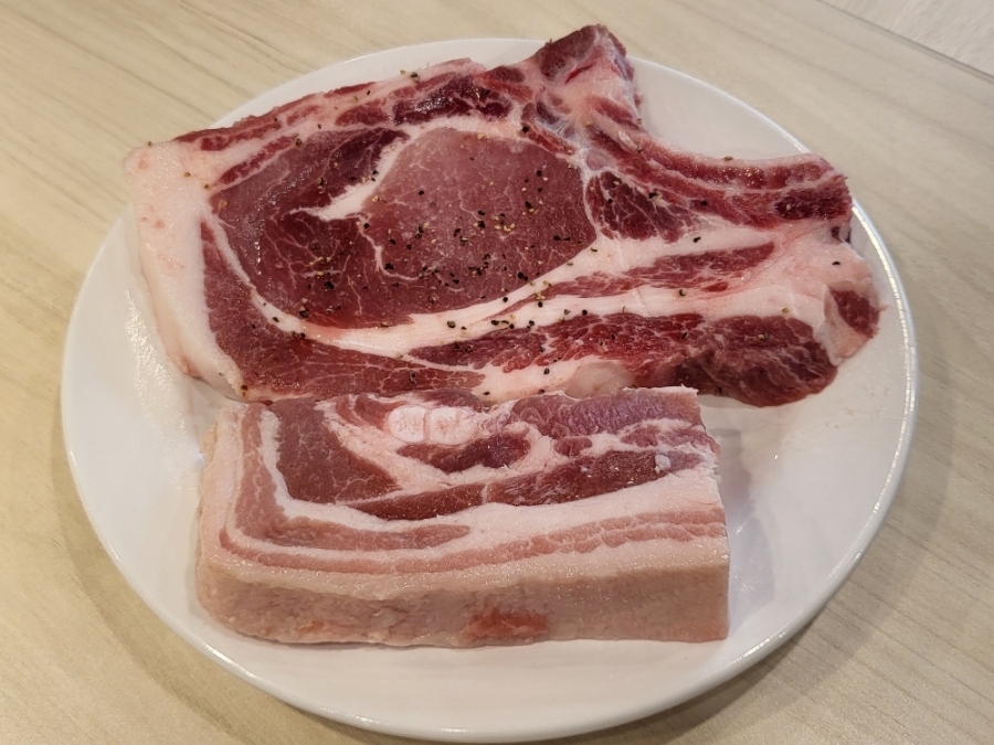 위에고기는 통갈비(프렌치랙) 밑에는 통삼겹살로 가볍게 시작해 보도록 하죠!