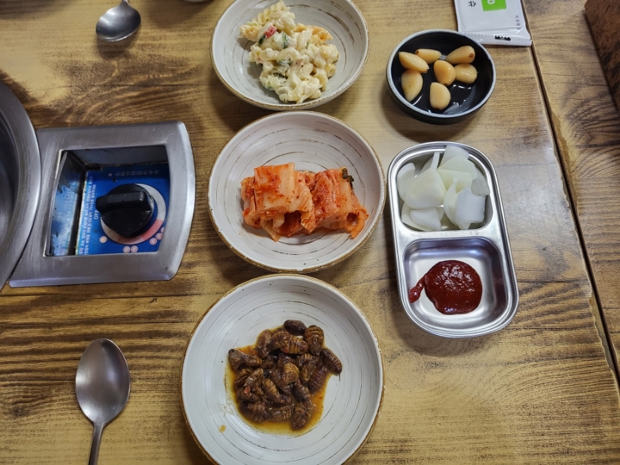 마카로니, 김치, 번데기, 마늘장아찌, 양파와 고추장, 숭늉등이 준비된 모습