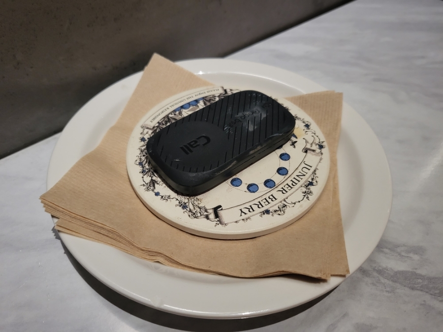 각테이블에 티슈와 함께 진동벨이 놓여져
