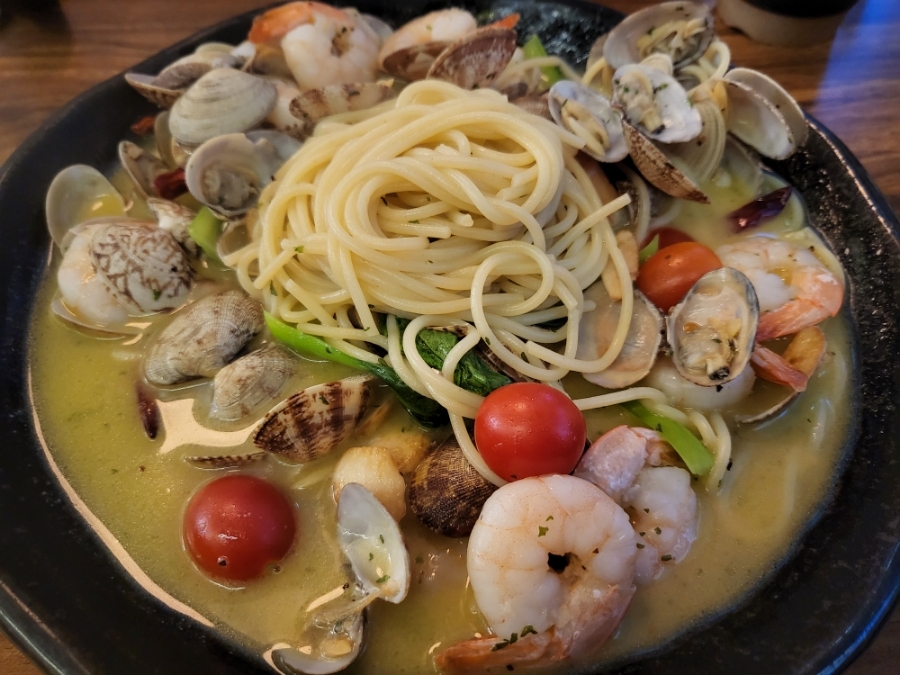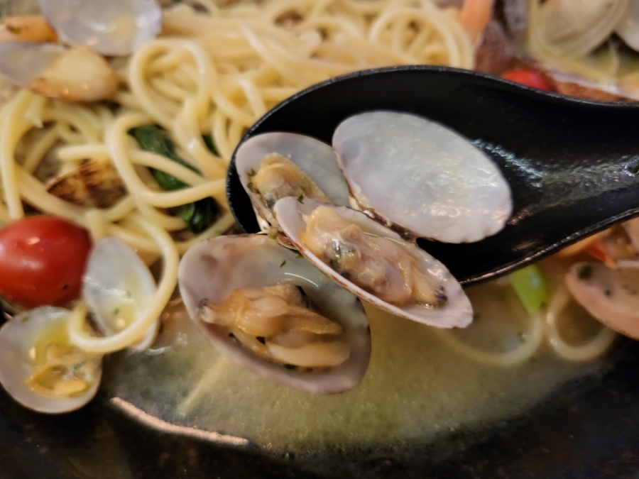방울토마토, 바지락, 새우, 마늘등이 푸짐하게 들어가 보기에도 좋았고 개인적으로 술찜 국물이 일품 해산물향과 부드러운 버터향이 가히 폭발적이더라구요 파스타 식감도 딱