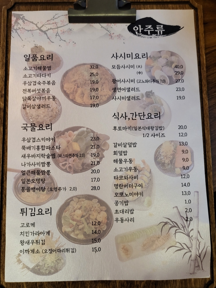 일품요리, 국물요리, 튀김요리, 사시미요리, 식사 •간단요리로 나뉘어서 판매하고 있네요