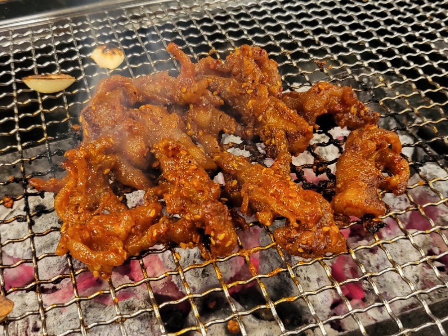 양념이 진득한 양념무뼈닭발을 숯불에
