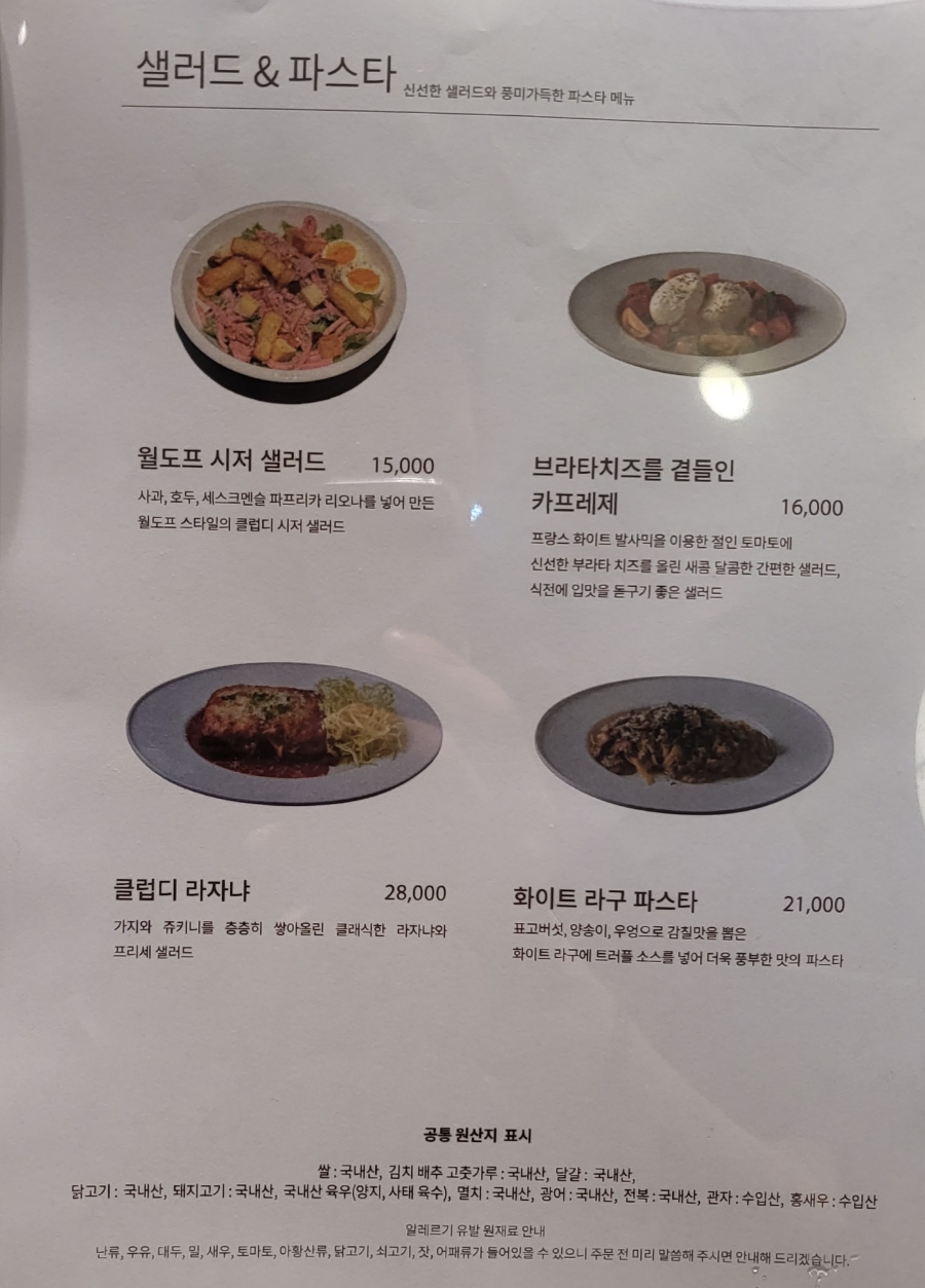 윌도프 시저 샐러드 - 15,000원브라타치즈 카프레제 - 16,000원클럽디 라자냐 - 28,000원화이트 라구 패스타 - 21,000원 |