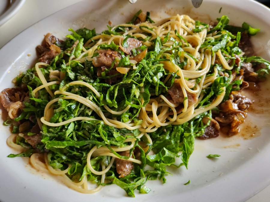 차돌불고기, 파스타, 샐러드(깻잎) 3가지를 비벼먹는 동서양에 퓨전 음식으로 보이네요