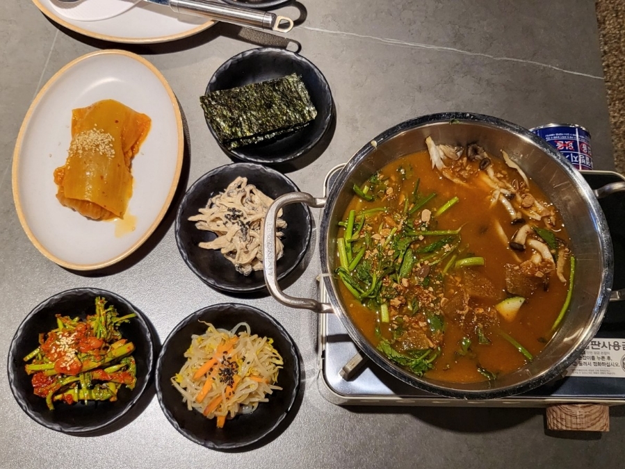 묵은지 김치찜, 김, 버섯, 콩나물무침나물무침, 미나리 된장전골 |
