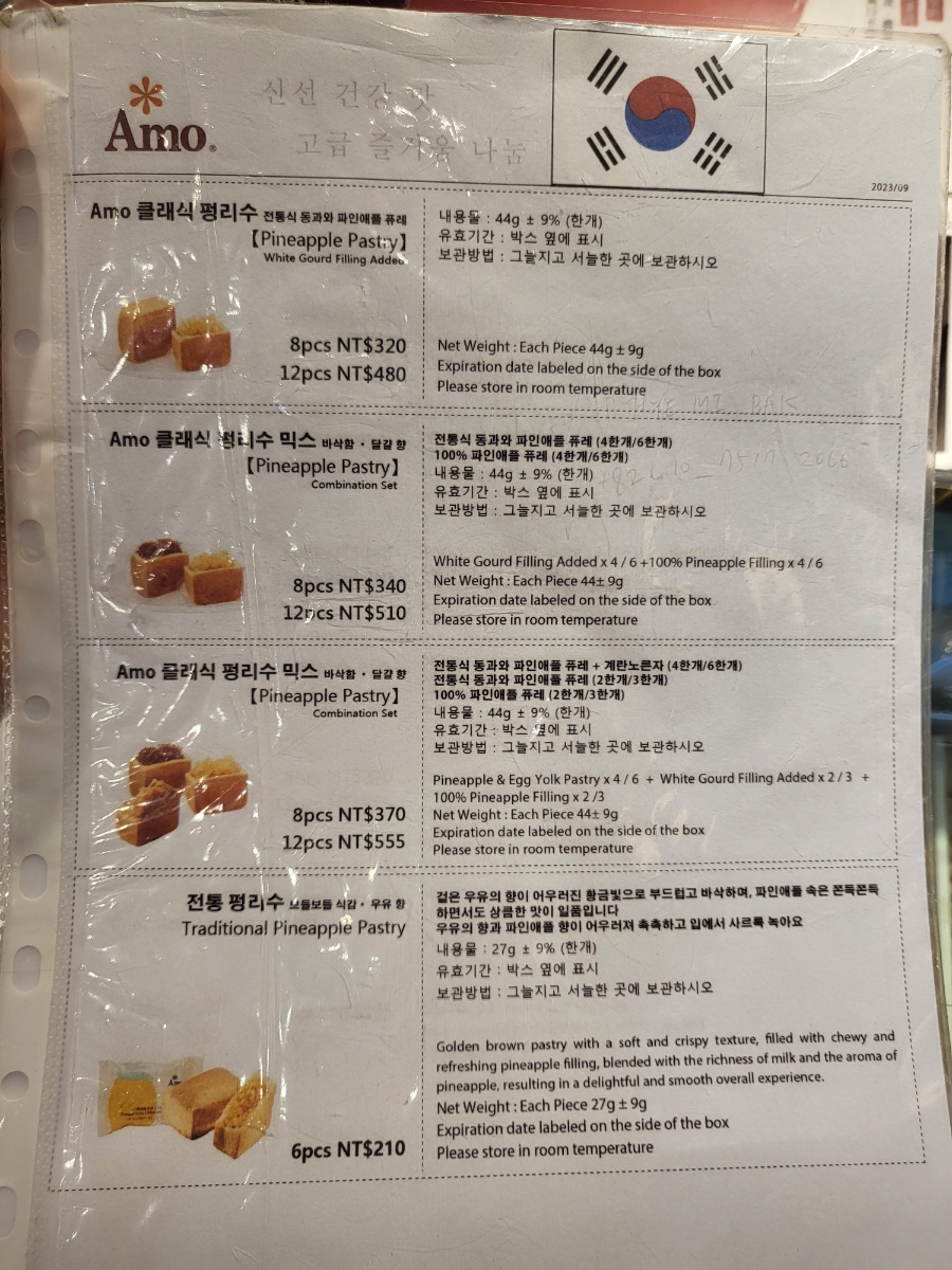 1. Amo 클래식 펑리수- 8개 320대만달러 = 13,760원- 12개 480대만달러 = 20,640원2. Amo 클래식 펑리수 믹스2가지맛(클래식+100%파인애플 퓨레)- 8개 340대만달러 = 14,620원- 12개 510대만달러 = 21,930원3. Amo 클래식 펑리수 믹스3가지맛(클래식+100%파인애플 퓨레 +계란노른자 포함)- 8개 370대만달러 = 15,910원- 12개 555대만달러 = 23,865원4. 전통펑리수(우유향)- 6개 210대만달러 = 9,030원※ 1대만달러 - 43원기준 |