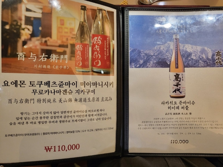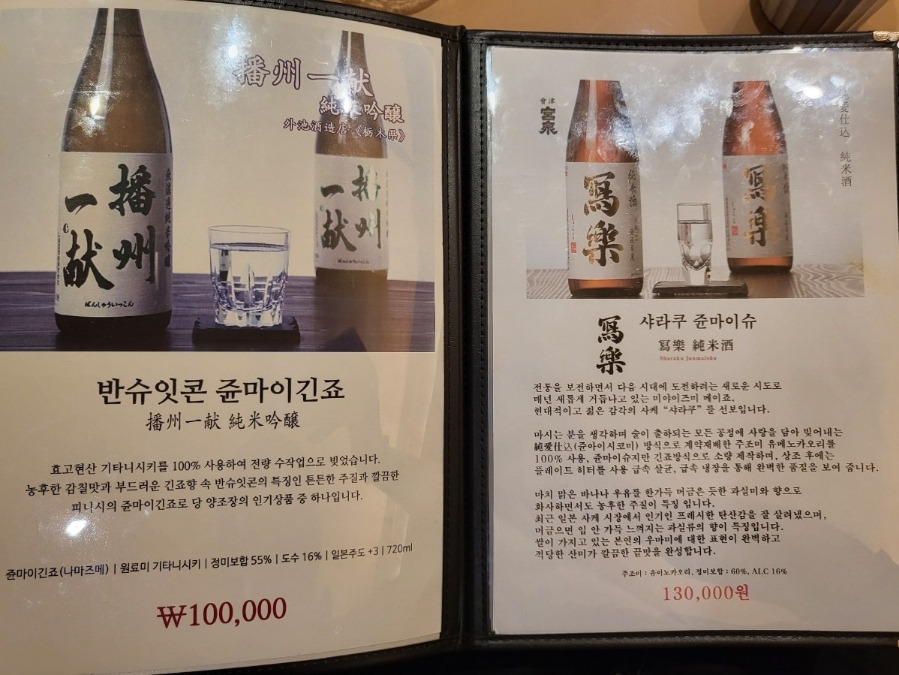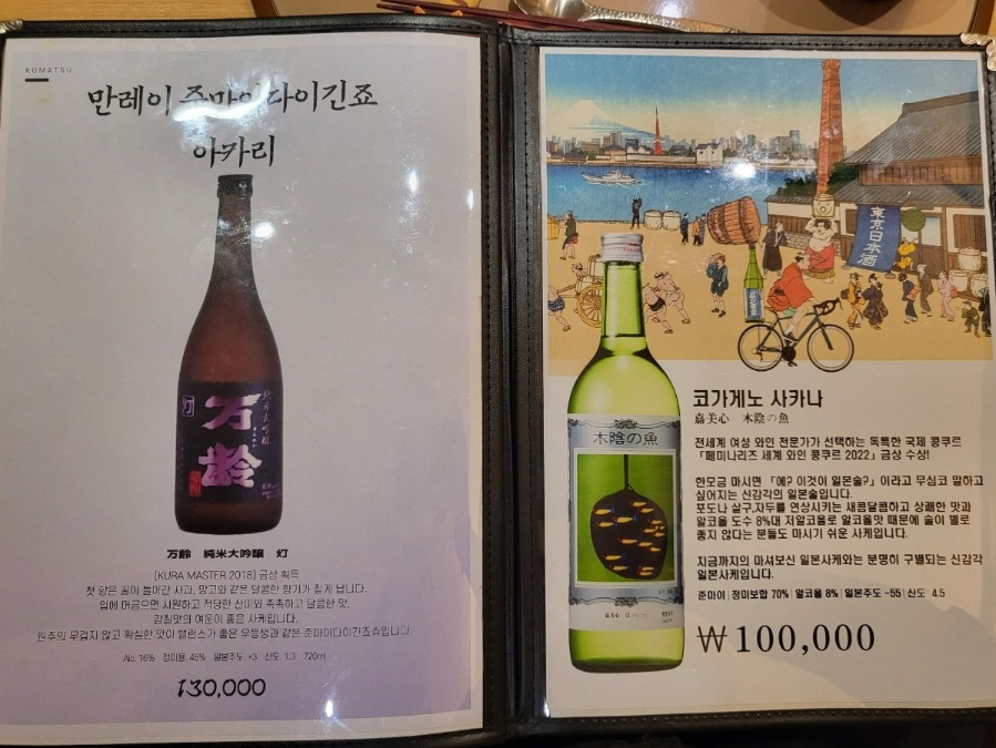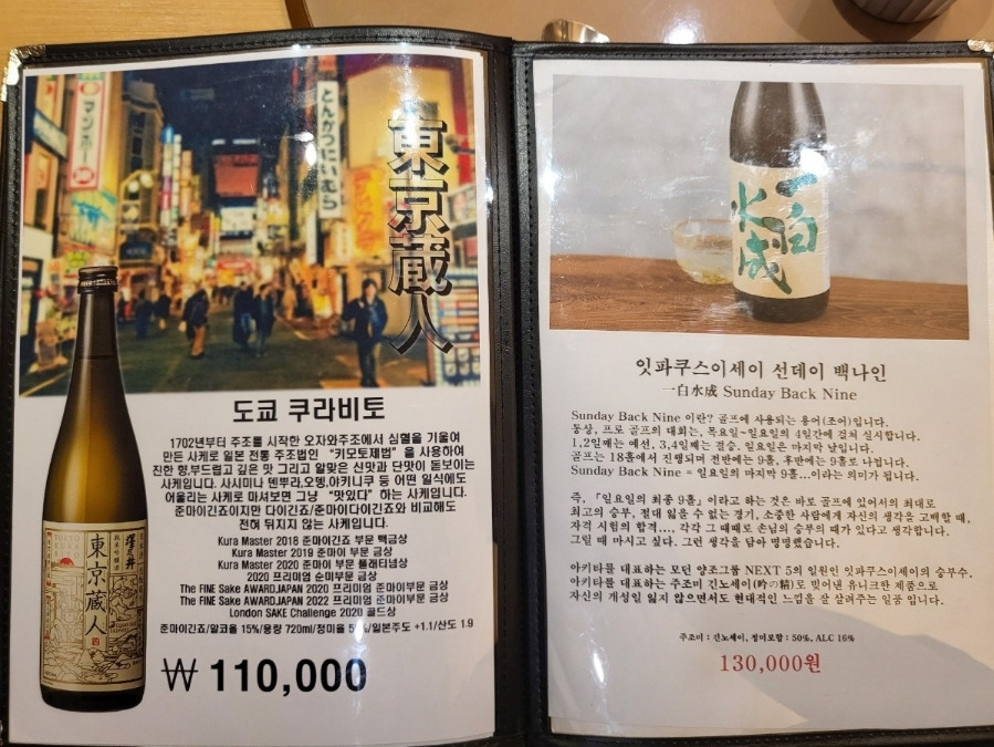 디너 1부 17시20분 (38,000원)디너 2부 19시 50분 (48,000원)사케 1병 필수 주문 평균100,000원※ 1인당평균가격 9만~11만원 |