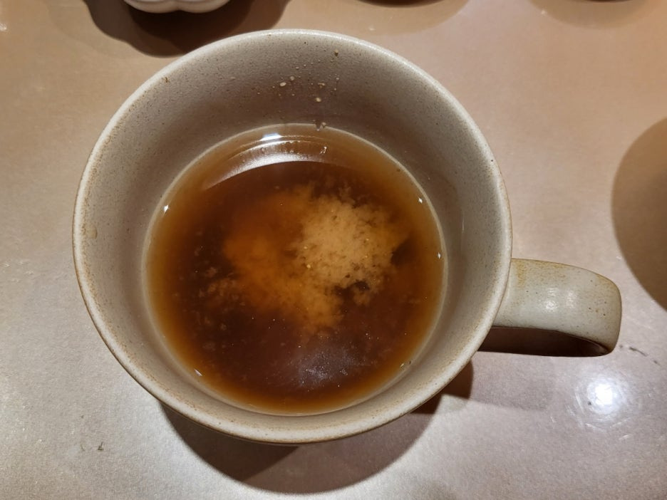 초생강, 간장, 와사비, 사케잔과 물컵스푼과 젓가락, 보리차 |