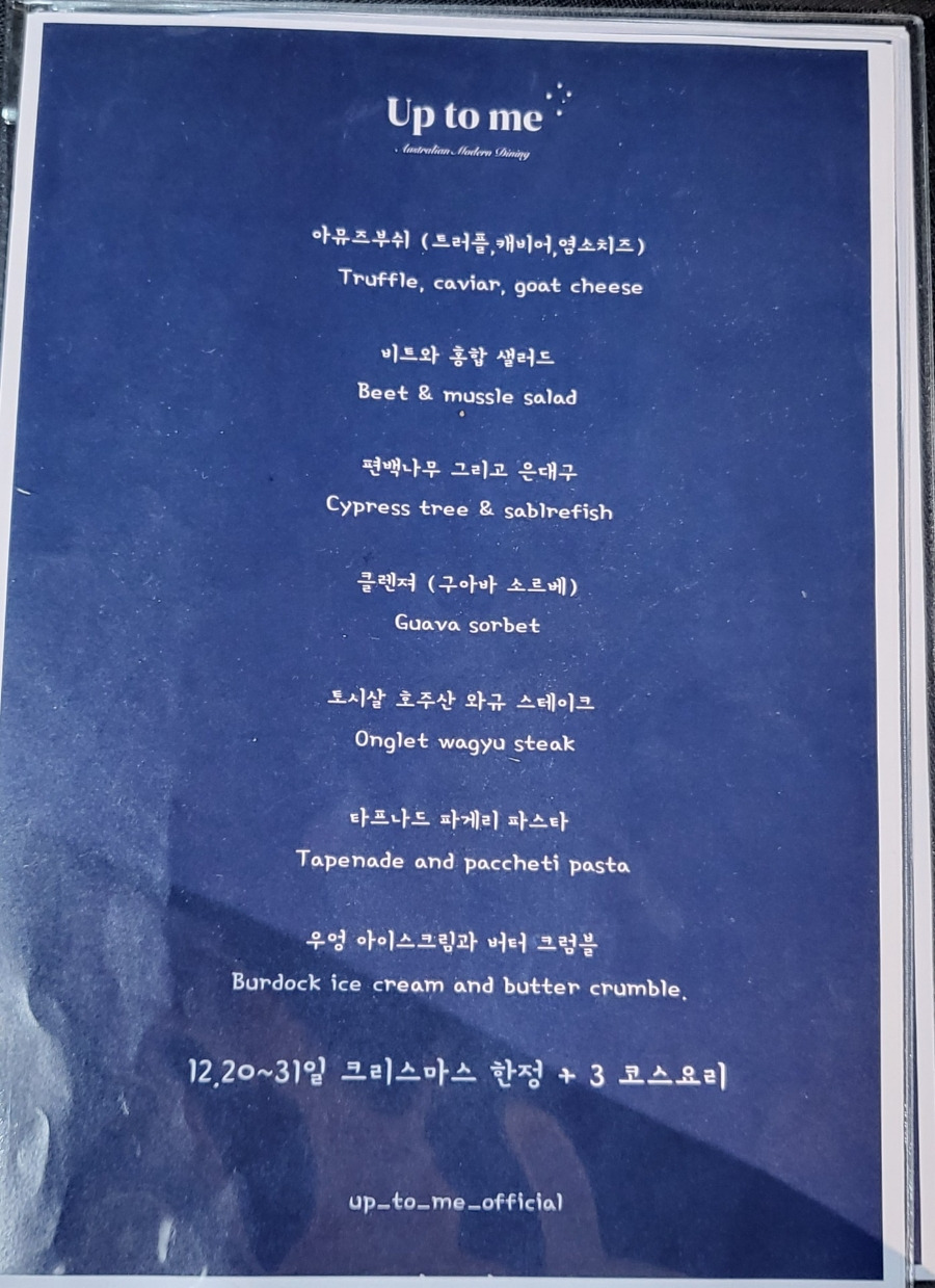 연남동 맛집 업투미 식사 메뉴판 모습입니다