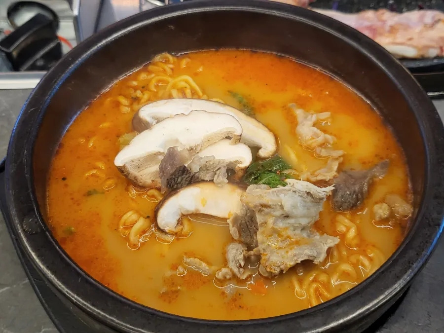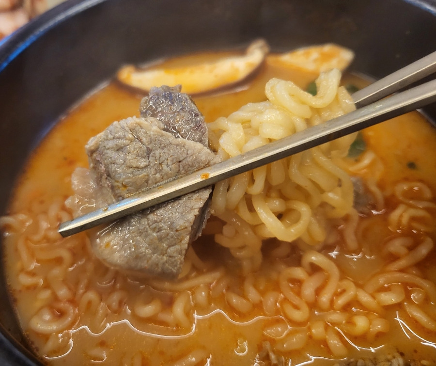 소고기사골국물에 담백함과 깊은맛 + 라면스프에 살짝 매콤함, 고기는 입안에서