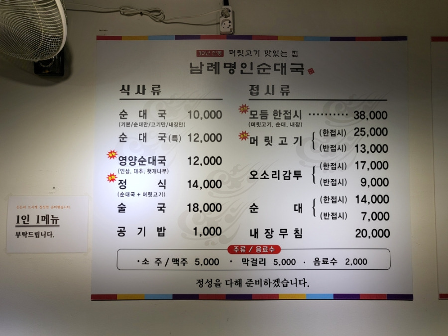 남례명인순대국 메뉴판 모습입니다
