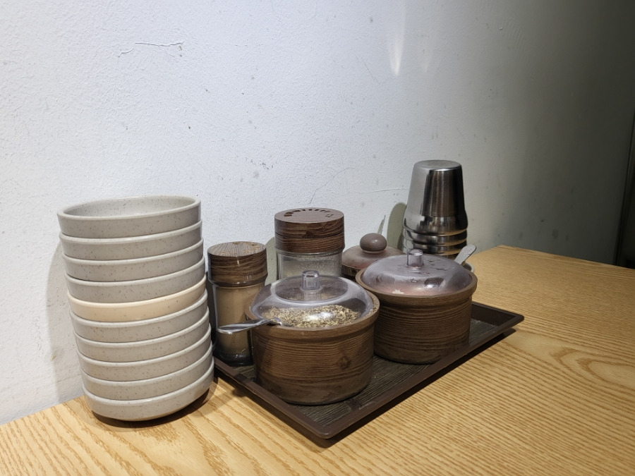테이블에는 소스접시와 소금, 후추, 들깨,
