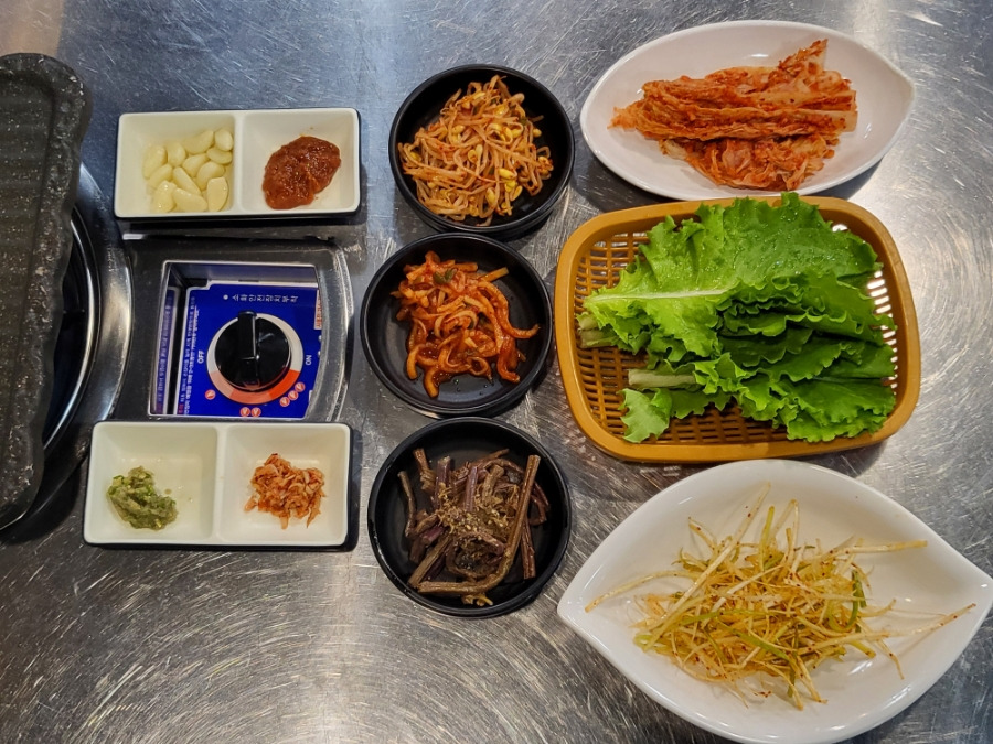 마늘,쌈장,고추+양파+잔멸치양념,새우젓, 콩나물무침, 무채무침,고사리, 숙성김치, 쌈채소파채무침, 계란찜 |