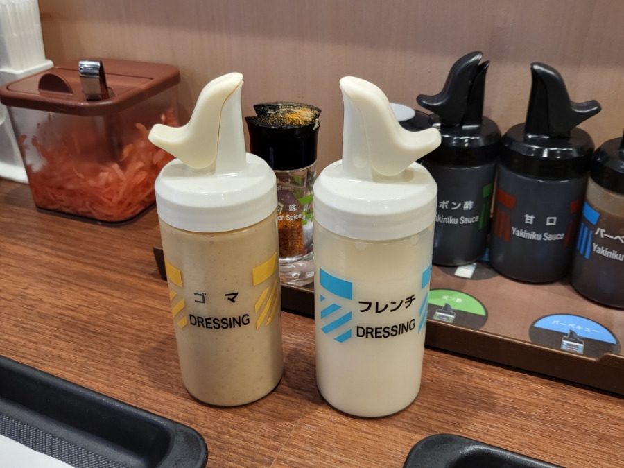 테이블 앞에있는 2가지 샐러드 드레싱이