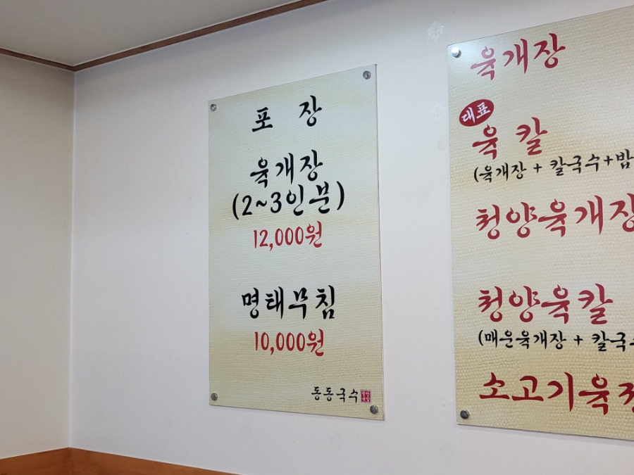 1. 육칼 - 12,000원2. 명태막국수 - 11,000원3. 소고기육전 반접시 - 8,000원4. 교자반반 - 6,000원 |
