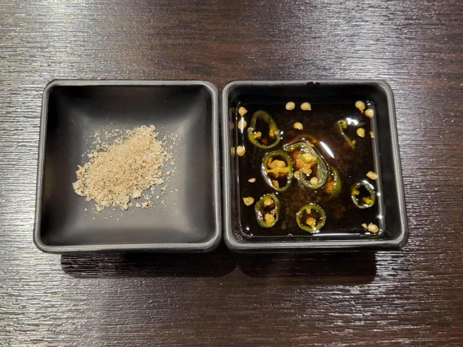 소금 및 고추간장소스, 당근과양파, 쌈장과편마늘, 갓김치, 쌈채소,부추무침 |