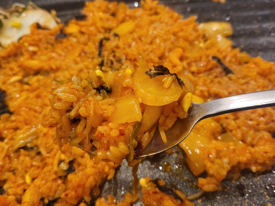 살짝 버터나 마가린에 향과 윤기가 반들반들 빛나고 있었어요, 나오는 즉시 먹어도 되고 점심시간에 따로 김치볶음밥으로 팔아도
