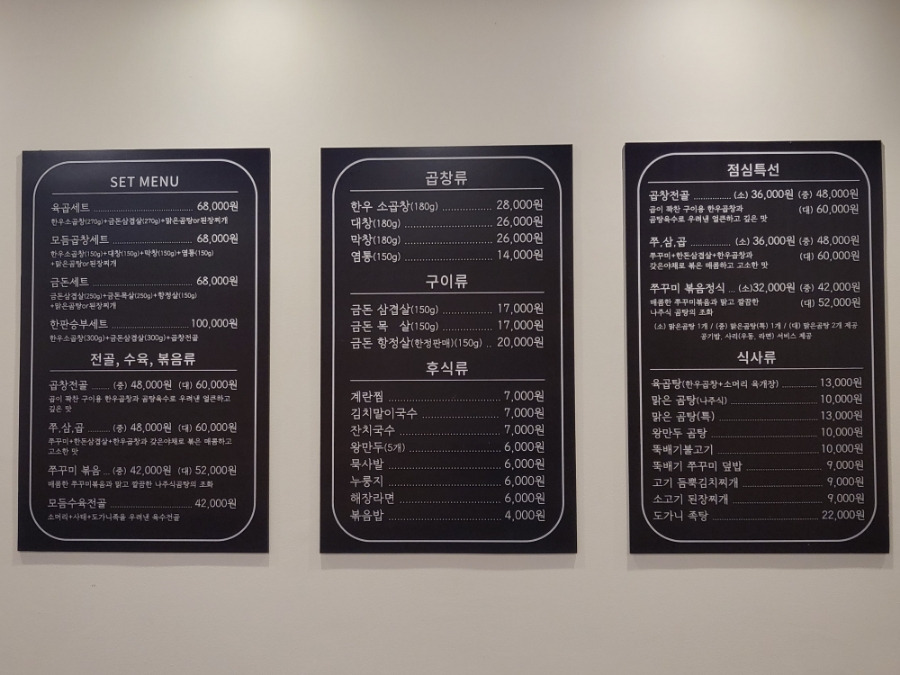 소곱창, 곱창전골 / 돼지고기 구이 / 쭈꾸미, 모듬수육 전골 / 국밥 곰탕까지 점심 든든한 한끼식사 메뉴들도 있어 오전 오후