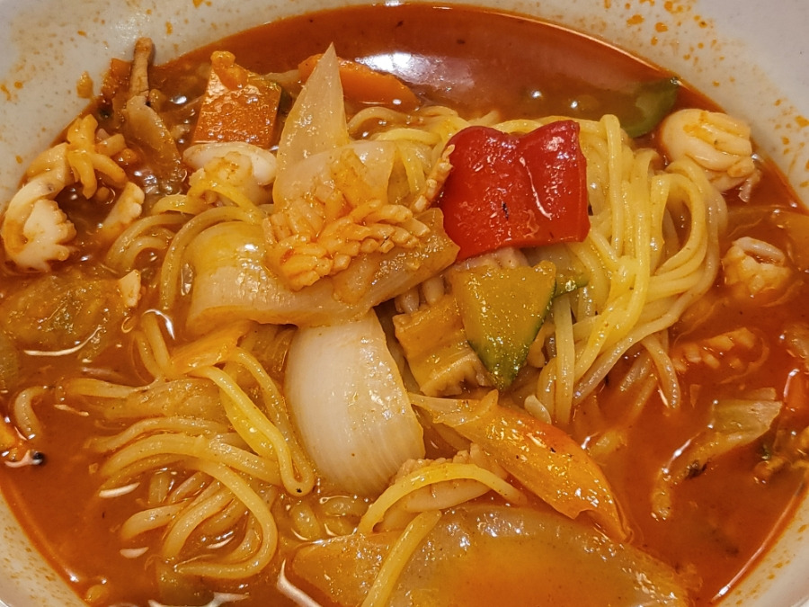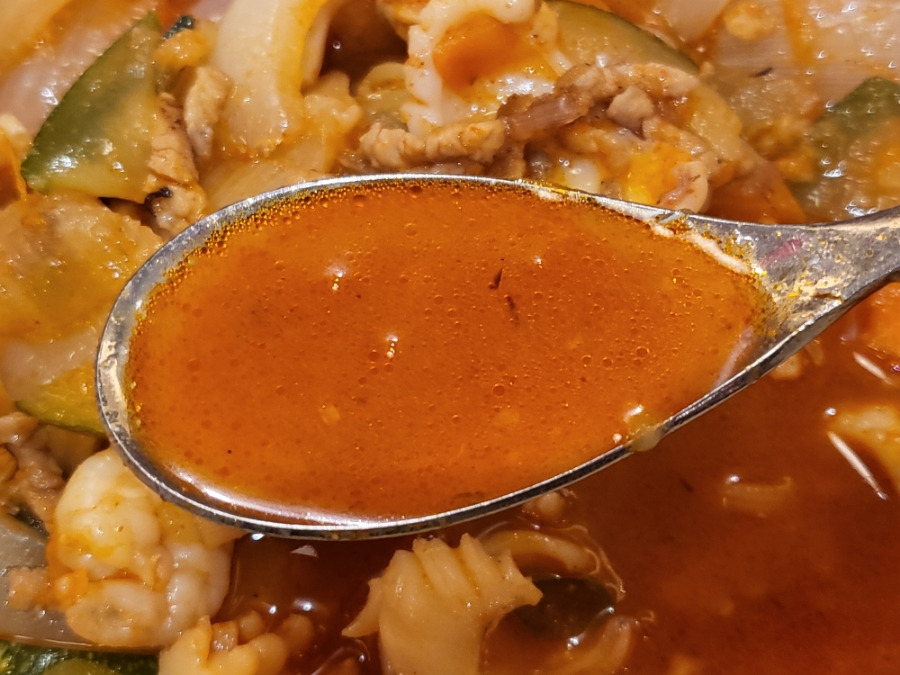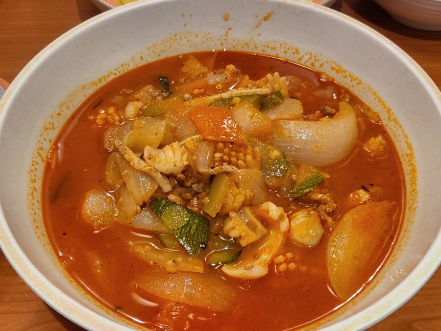 푸짐한 해물과 면양, 양파나 호박등 채소