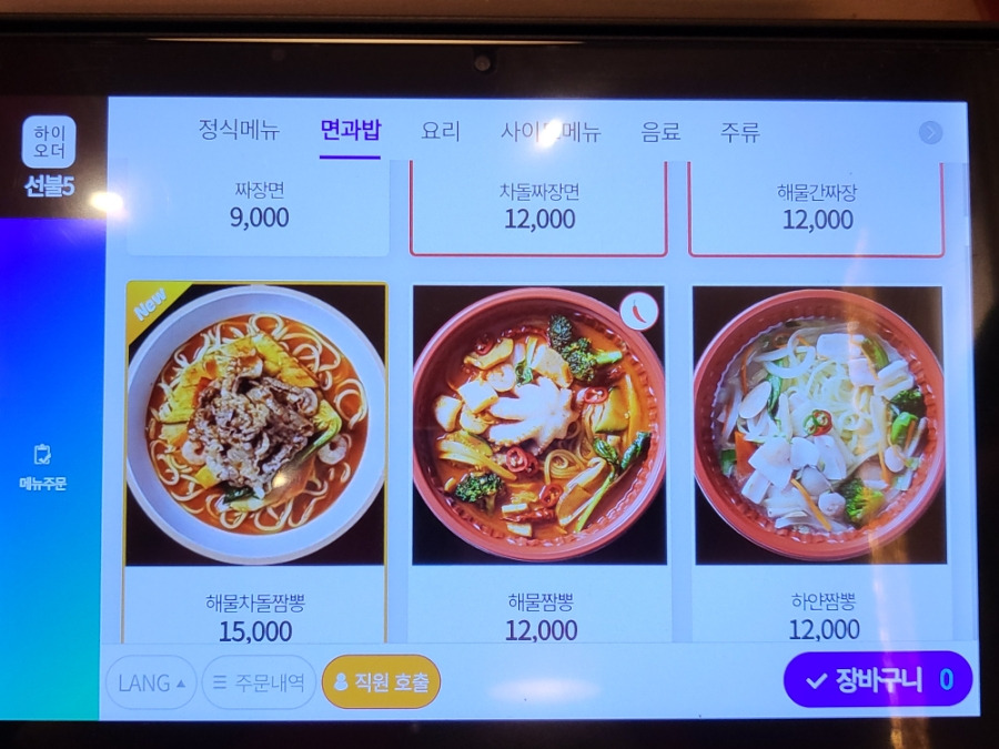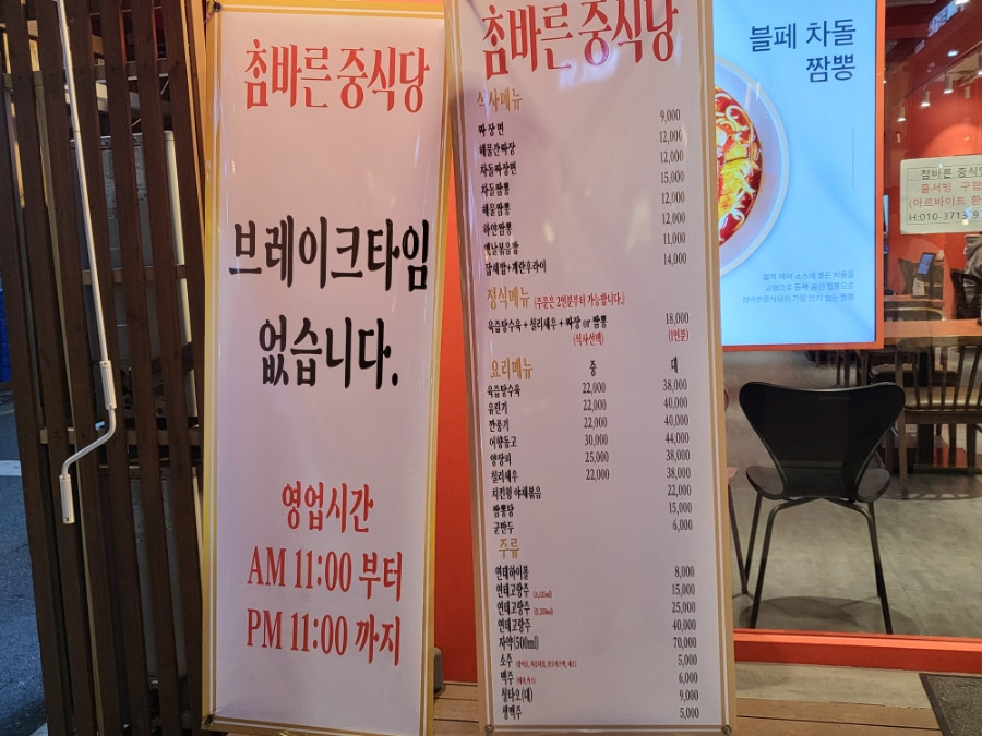 1. 해물간짜장 - 12,000원2. 해물짬뽕 - 12,000원3. 육즙탕수육(중) - 22,000원 |