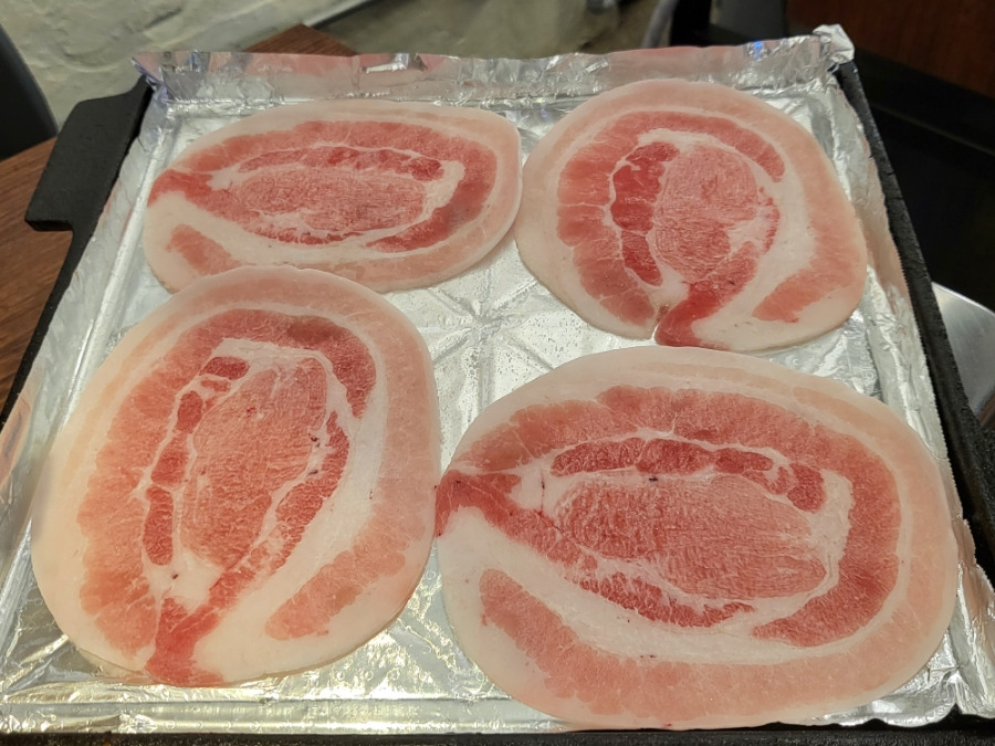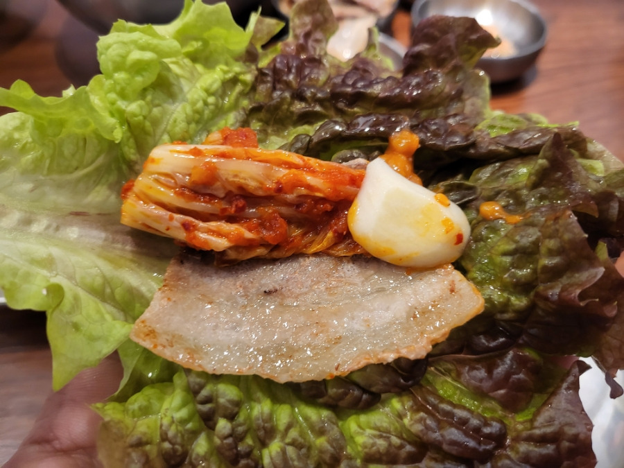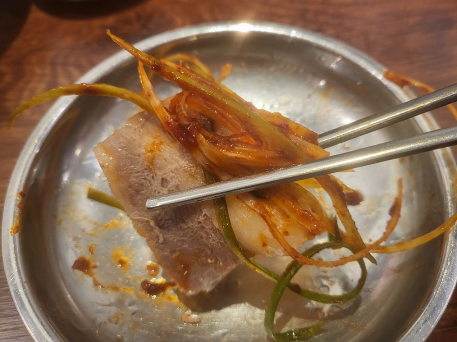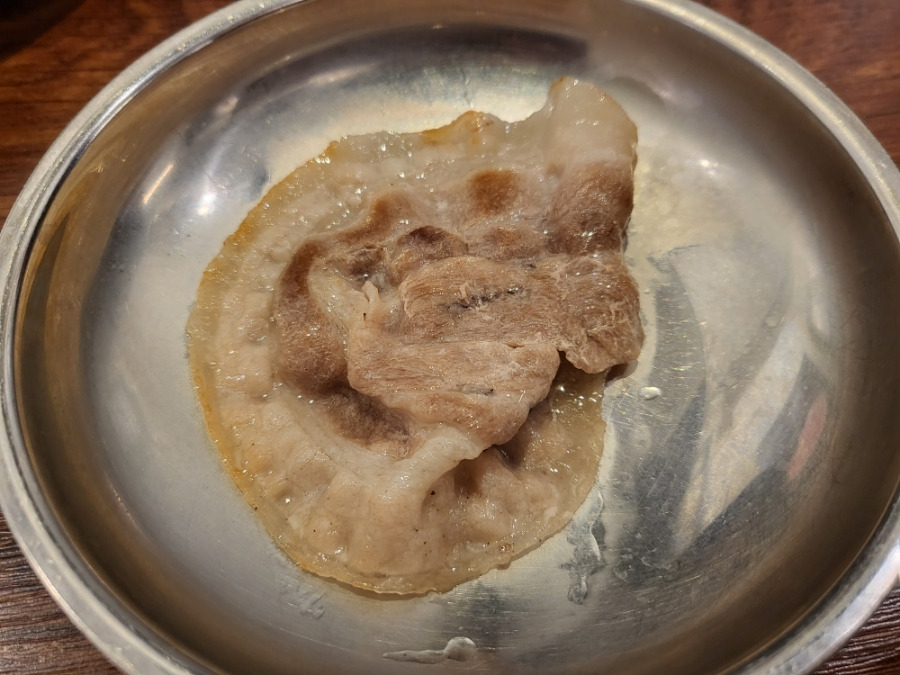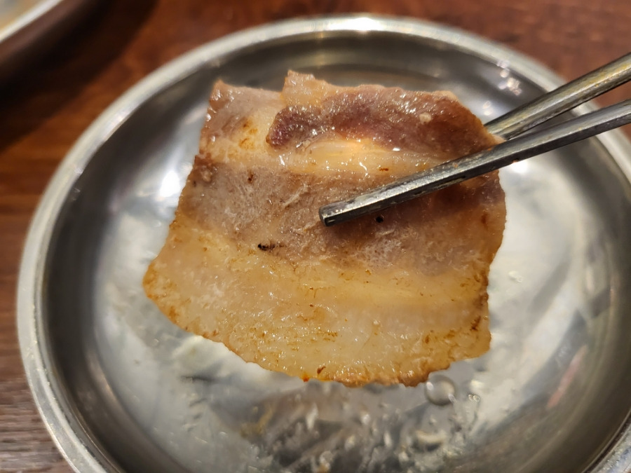 굉장히 빨리 구워지며 기름과 윤기가 흘렀던 삼겹살로 한점한점이 커 입안 가득 만족감을 주는 부위였어요, 고기를 펼치면 그 자체가 쌈크기라 꽃삼겹에 파채나 다양한 사이드를 넣어서 먹으면 아주 만족스럽다구요, 얇은 삼겹살인데도 기름기가 상당하며 깔끔한 맛이 인상적이네요