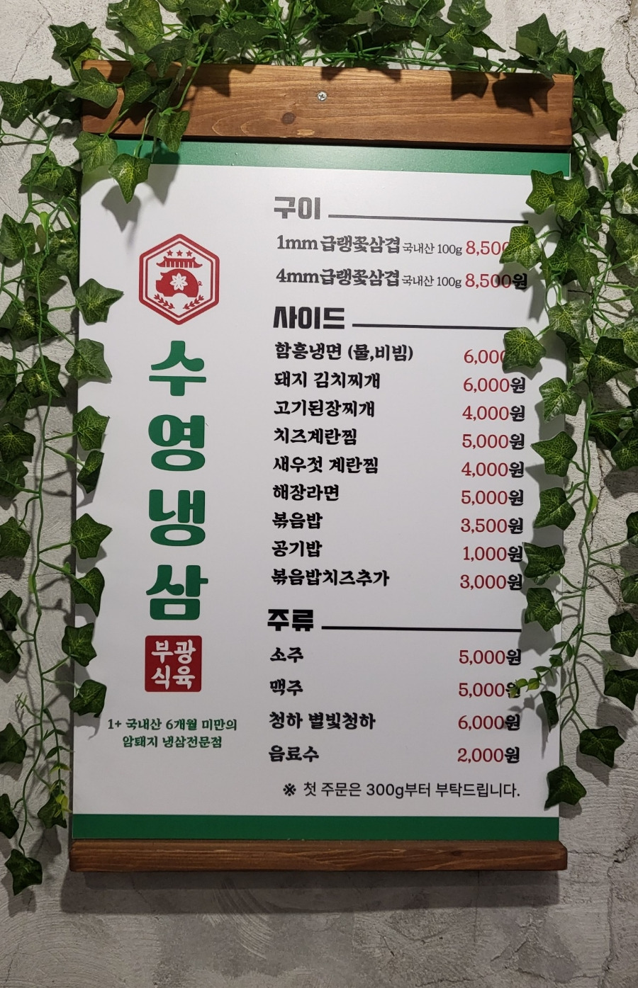 사당맛집 수영냉삼 메뉴판 모습입니다